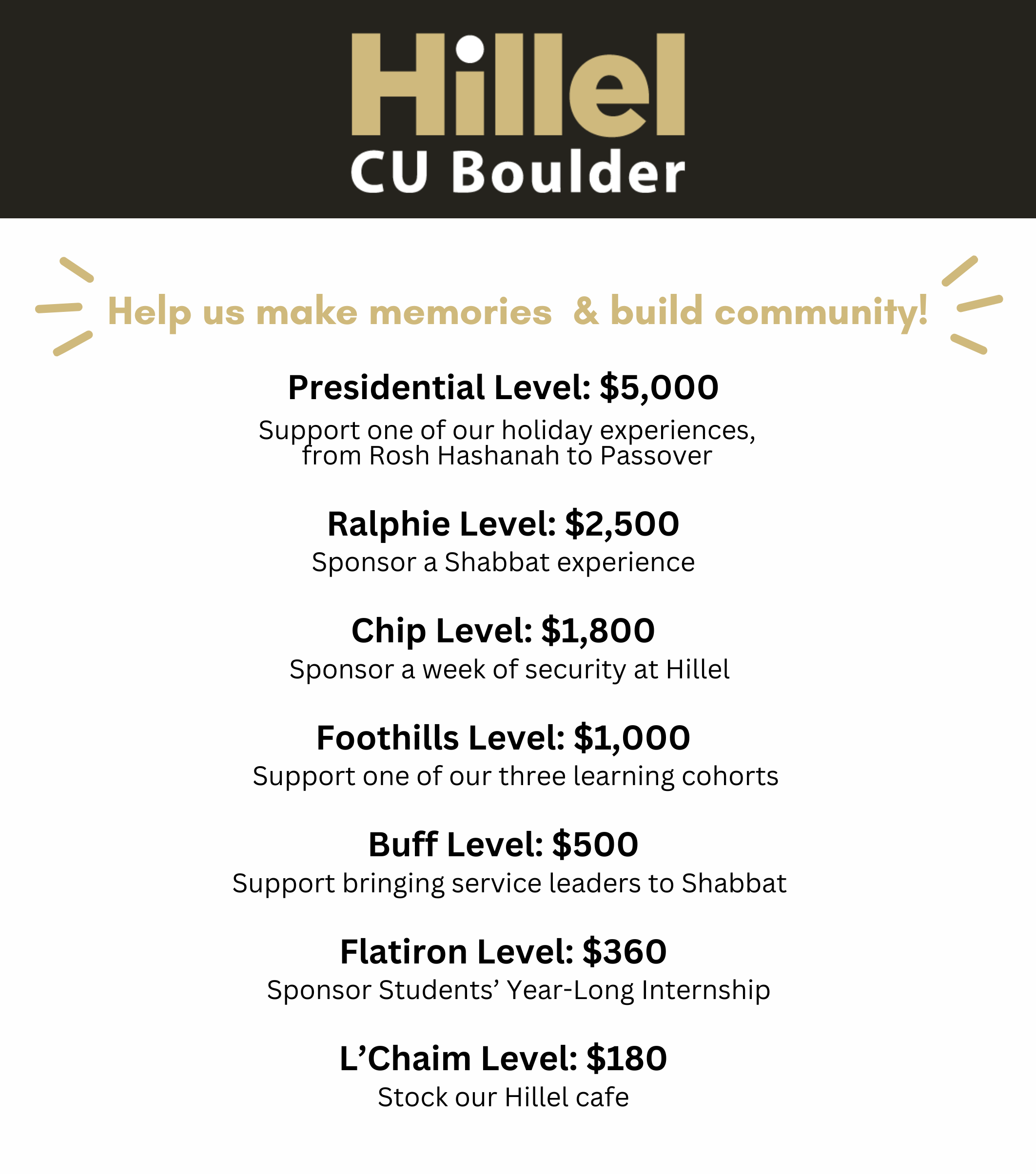 For over 3000 Jewish students, CU Boulder Hillel is the Center for Jewish Life on campus and the Jewish home-away-from-home. At Hillel, our goal is to build a Jewish community whose values enrich the lives of students during their college years and beyond. Our mission can only be achieved through the generosity of parents, alumni, community members, and friends.